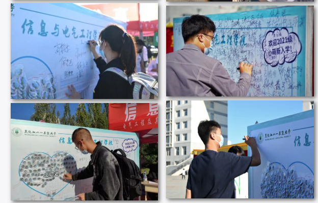 为了迎接2021级新生到来,尊龙凯时人生就是博z6com与电气工程学院在主楼前广场和体育馆的学院接待处摆放了“信电徽章纪念墙”,前来报到的新生可以在纪念墙前签名、合影留念。同时,由新生辅导员、学生志愿者为新生佩戴刻有“走进信电 励志行远”字样的纪念徽章。一枚枚徽章代表着学院老师、学长学姐对新同学的翘首企盼,更是期望他们在大学四年能够不负韶华、筑梦青春。校党委书记董广芝在纪念墙上签字,表达了对新生的期许展望。