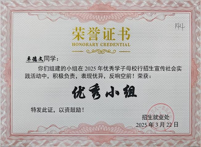 作为学校招生宣传的持续参与者,卓德文多次参与“优秀学子母校行”招生宣传社会实践活动,走进大庆外国语学校,为母校的学弟学妹们搭建起大学与高中的沟通桥梁。活动中,他以自身求学经历为切入点,用生动鲜活的语言详细讲解黑龙江八一农垦大学的办学特色、专业优势、校园生活及升学就业等学弟学妹们关心的问题,耐心解答大家的疑惑,让高中同学们对八一农大形成了直观的认知。